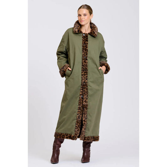 Shirty Leopard Reverso Long Faux Fur Reversible Coat - Leopard & Khaki