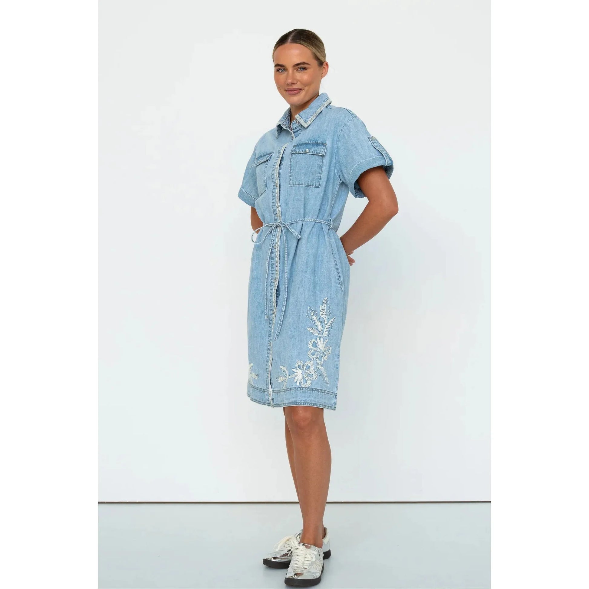 The Simone Dress is the easy mini shirtdress with a cool twist. Featuring patch utility pockets, buttons all down the front and an embroidered floral detail this is one-and-done kind of style that can be paired with sneakers for a cool, casual vibe.