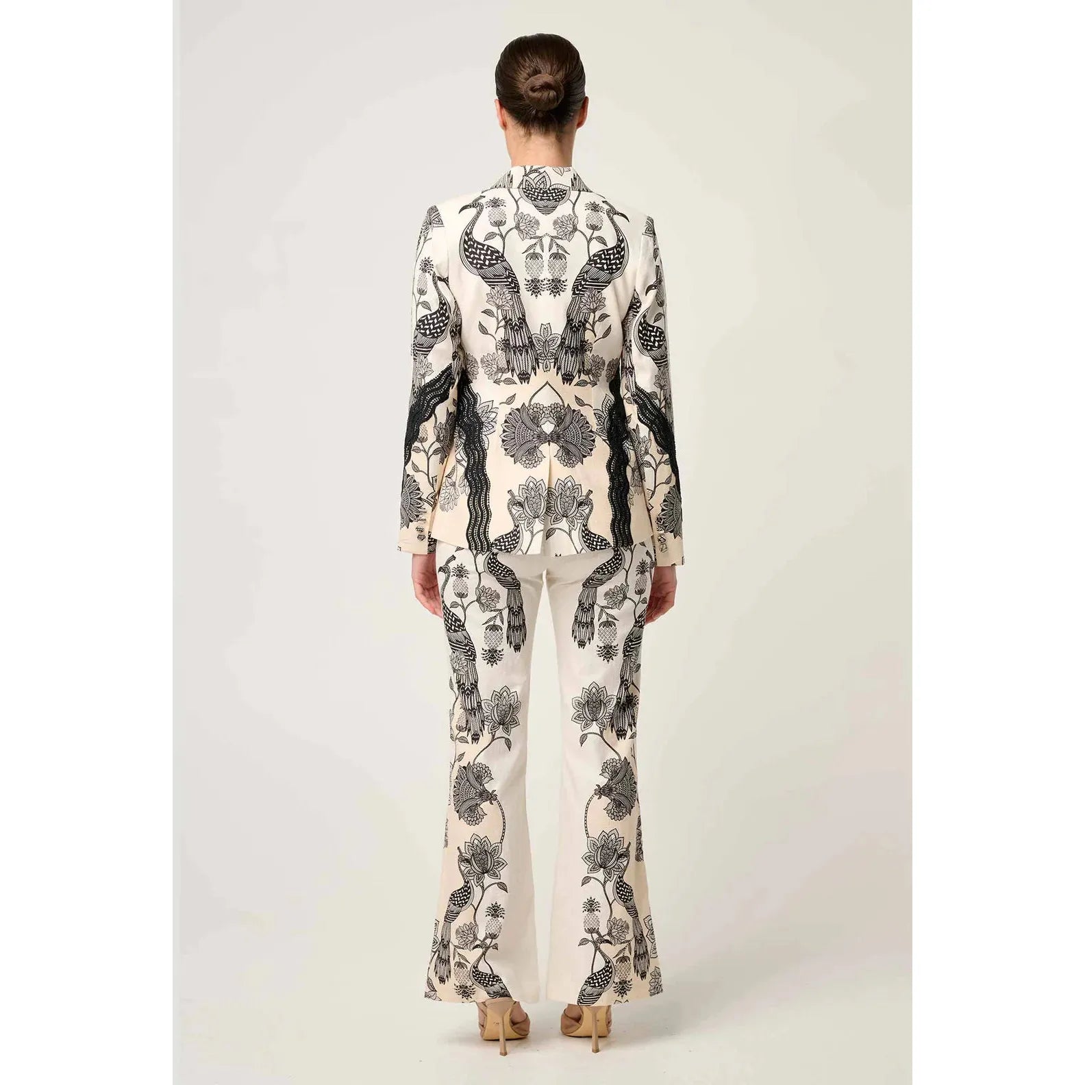 The striking black placement print, inspired by Eastern botanical motifs and graceful peacocks, is meticulously positioned to sculpt the body and make a bold visual impact. Delicate contrast lace trims run down the sleeves and sides, lending a subtle touch of texture and romantic refinement to this contemporary classic.
