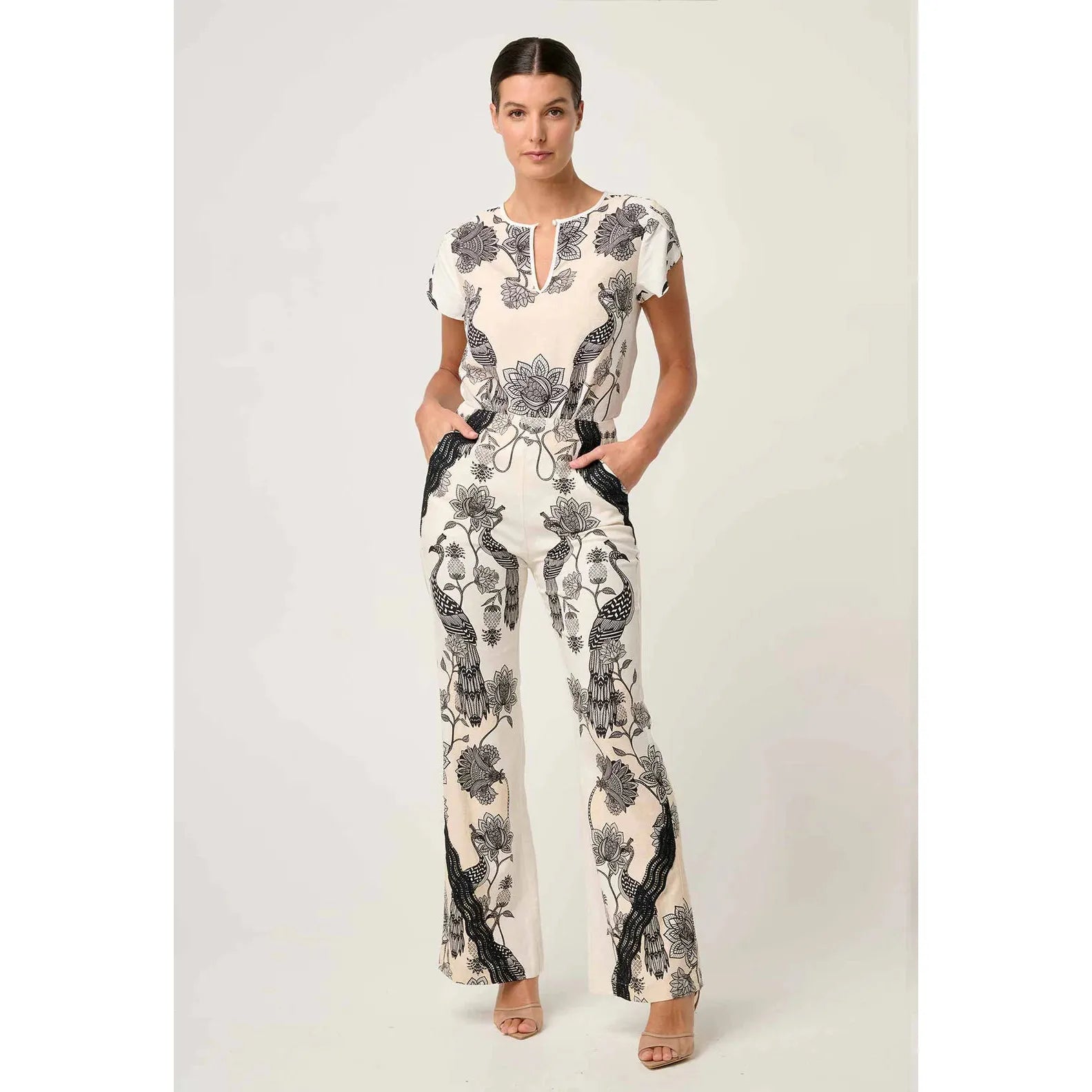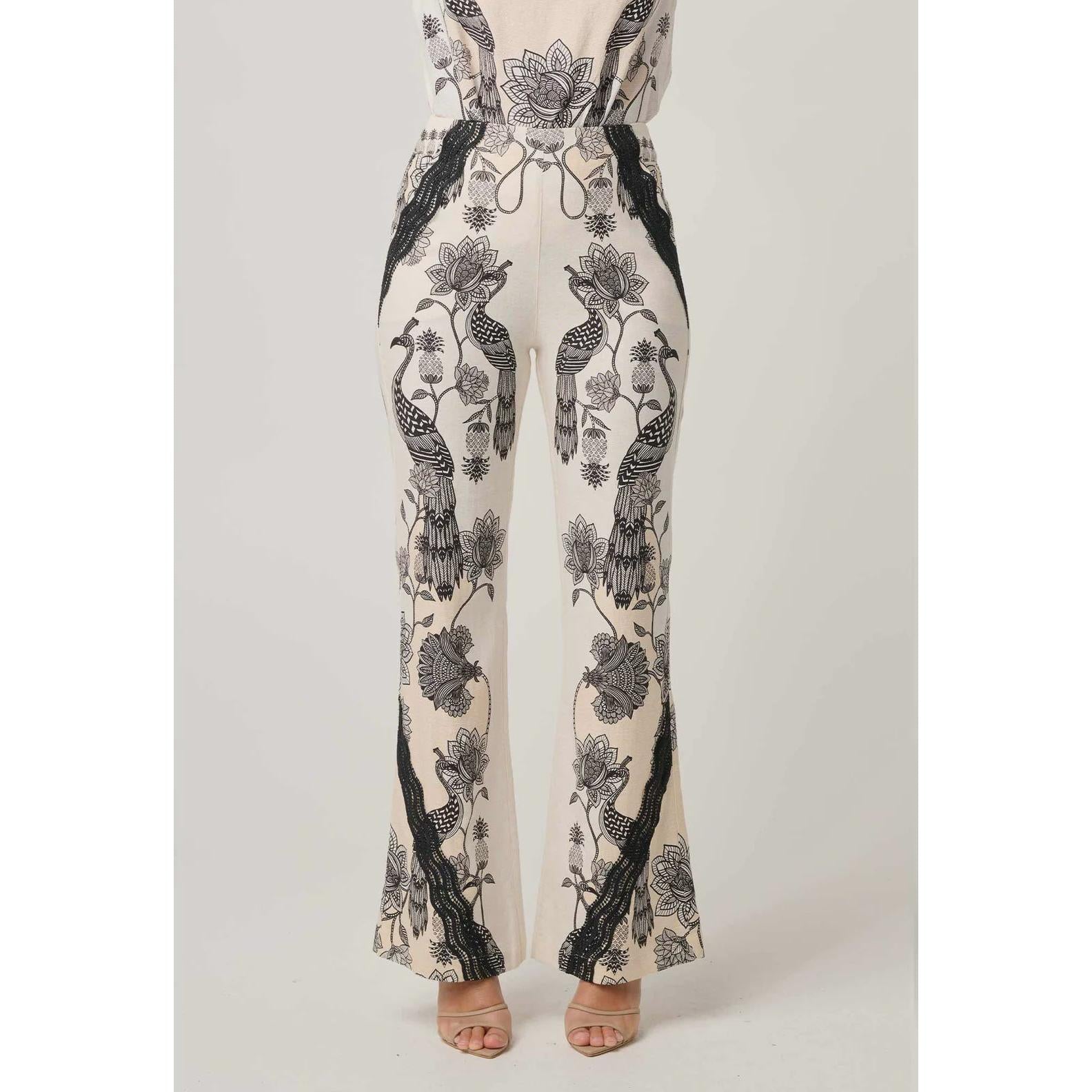 The tailored silhouette is enhanced with exclusive black placement prints, featuring elegant peacocks, lotus florals, and botanical motifs, artistically arranged to elongate the legs and draw the eye. Intricate contrast lace trim panels run vertically along the outer seams, adding a touch of romantic detail while accentuating the pants’ clean, elongated lines.