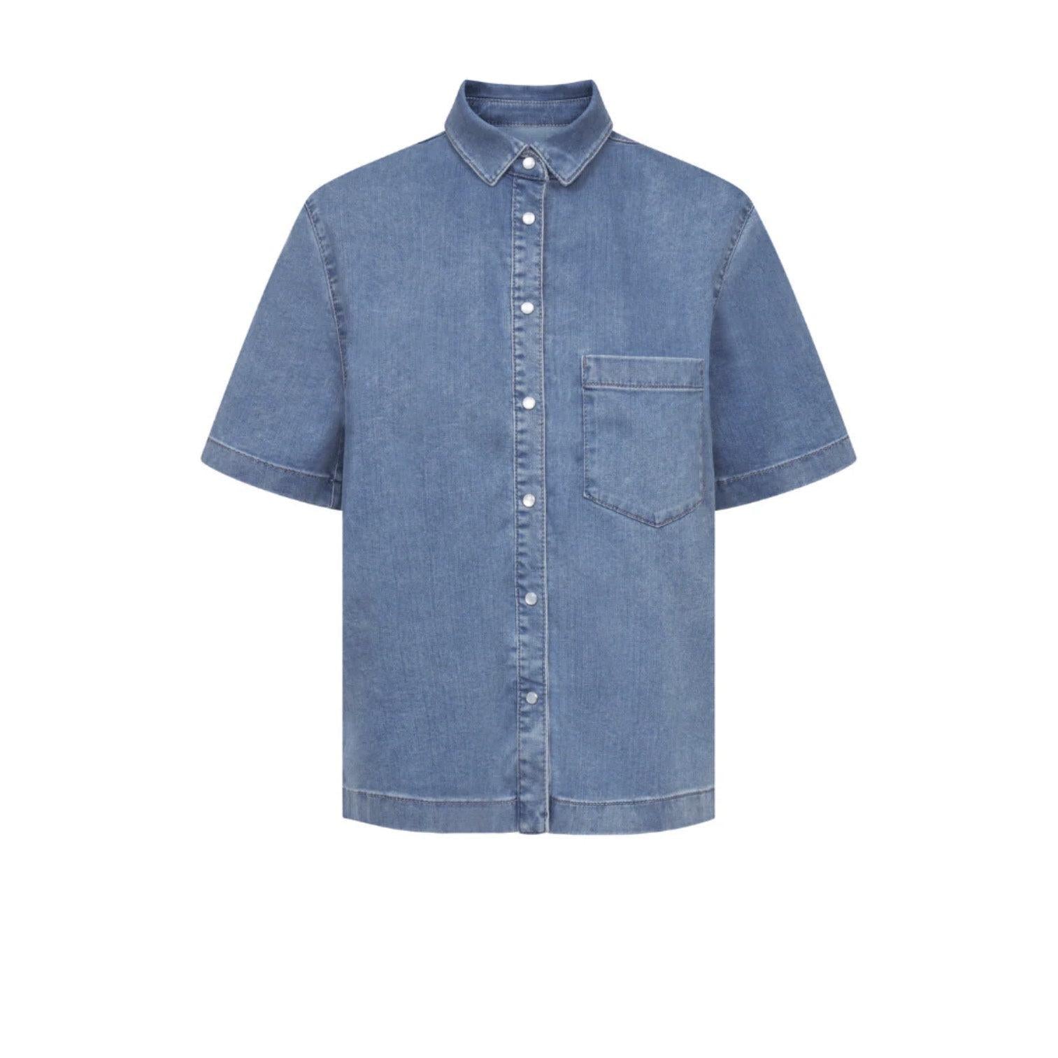 This relaxed-fit short sleeve Raffaello Rossi denim shirt features a soft, drapey silhouette with a front placket of press buttons, a chest patch pocket, and a box pleat at the back yoke for added comfort. Cut to a slightly cropped length, the Giuliette shirt blends classic denim style with modern comfort.