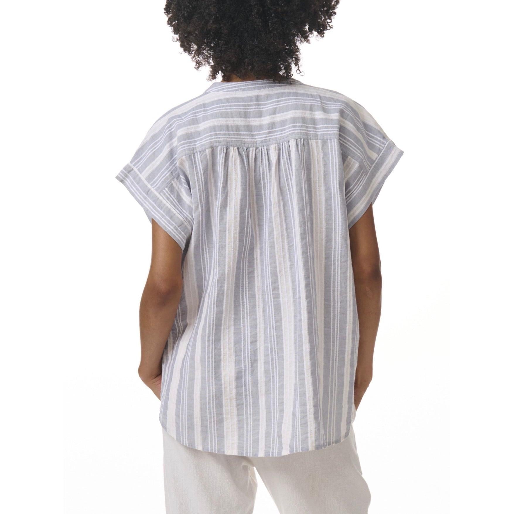 Crafted from a blend of 84% viscose and 16% linen, this blouse boasts a striped design in white and seaport hues. Its V-neck and button half placket add a touch of coastal charm, perfect for pairing with the Raegan Pant or your favorite denim.