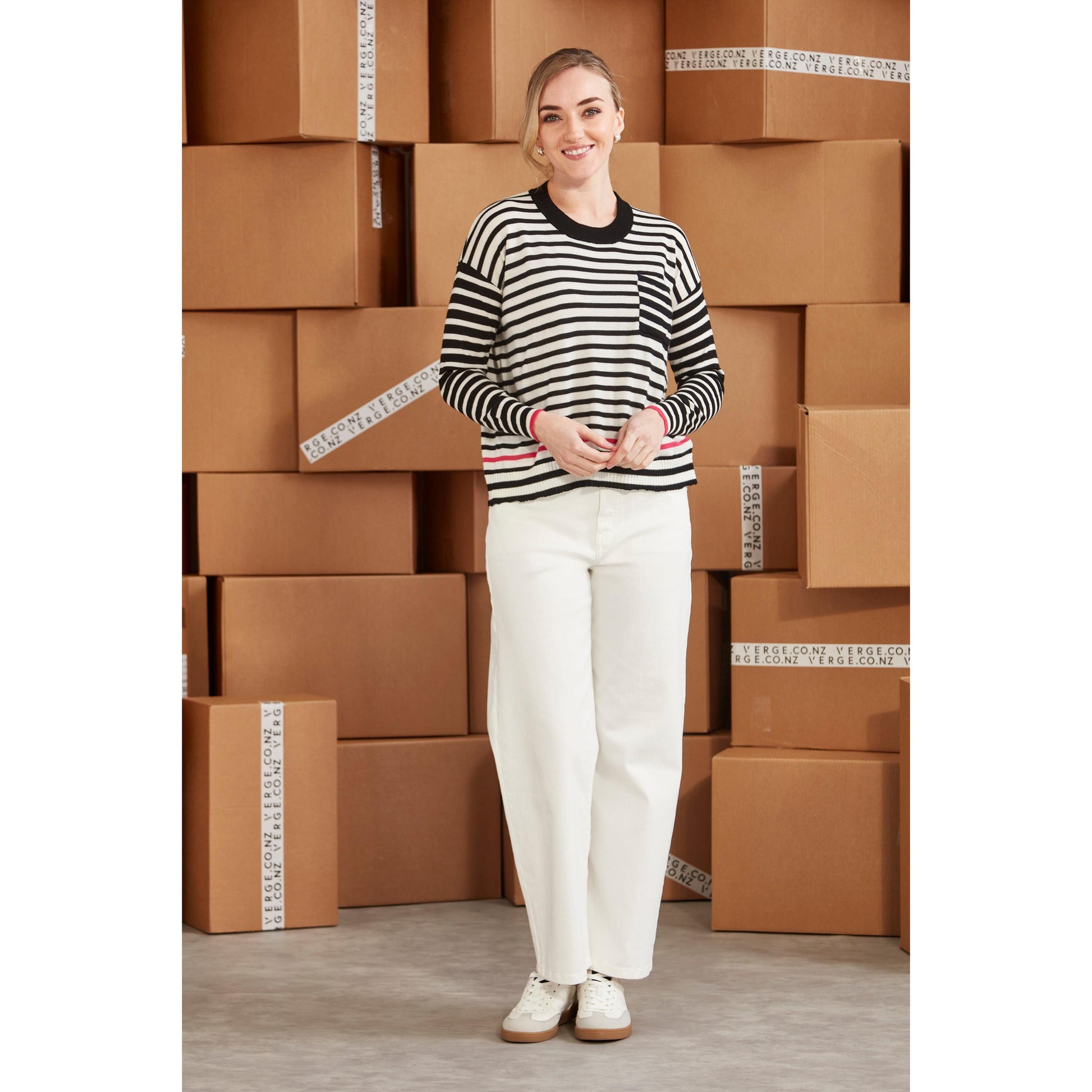 Wrap yourself in luxury with our 100% Merino Ghost Sweater! Featuring a low crew neckline and a front patch pocket, this striped sweater boasts a subtle pop of Pink on the body and cuffs. The deep ribbed cuffs and hemline ensure a perfect fit, while the sweater falls to your hips for a flattering silhouette. Feel effortlessly fashionable in our cozy Ghost Sweater.