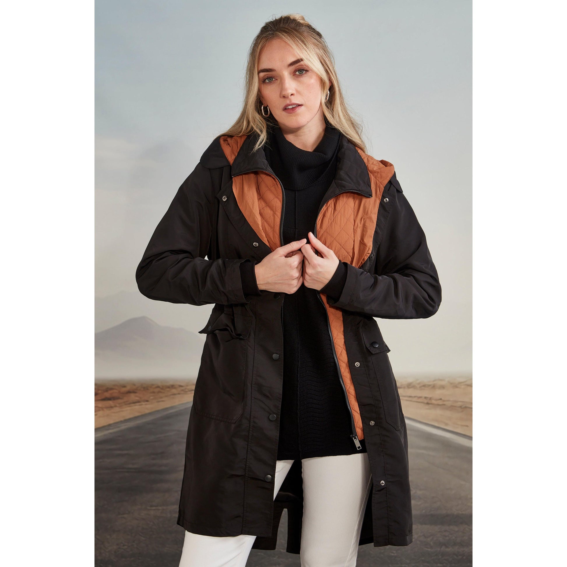 Stay dry and stylish in the Stargaze coat. Fully lined and showerproof, it features a quilted high neck and hood for added protection. Front patch pockets and an adjustable waist tie provide convenience and comfort, while the knit rib cuffs keep you cozy. With a centre back split, this coat falls just below the calf. Fully lined. Showerproof. Hood. Full length sleeve. Waist tie. Falls below the knee.
