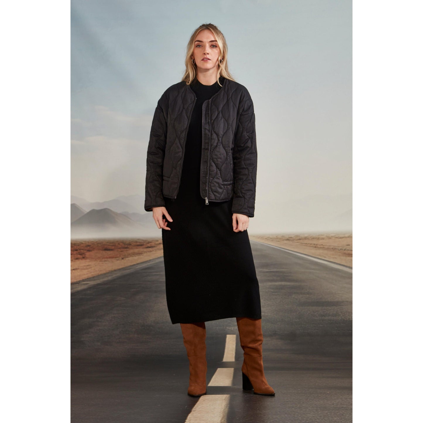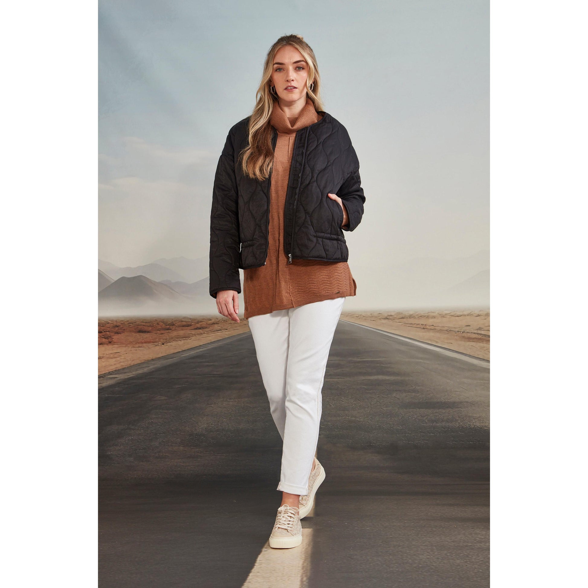 The Vega Jacket is a versatile addition to any wardrobe, combining comfort and style with its cotton and metal quilted material. The round neckline and zip front provide a sleek look, while the angled side pockets offer practicality. The full length sleeves and contrast bronze quilted lining add a touch of sophistication. With the option of a drawcord for shaping and a hip-length fit, this jacket is a must-have for this season and beyond.